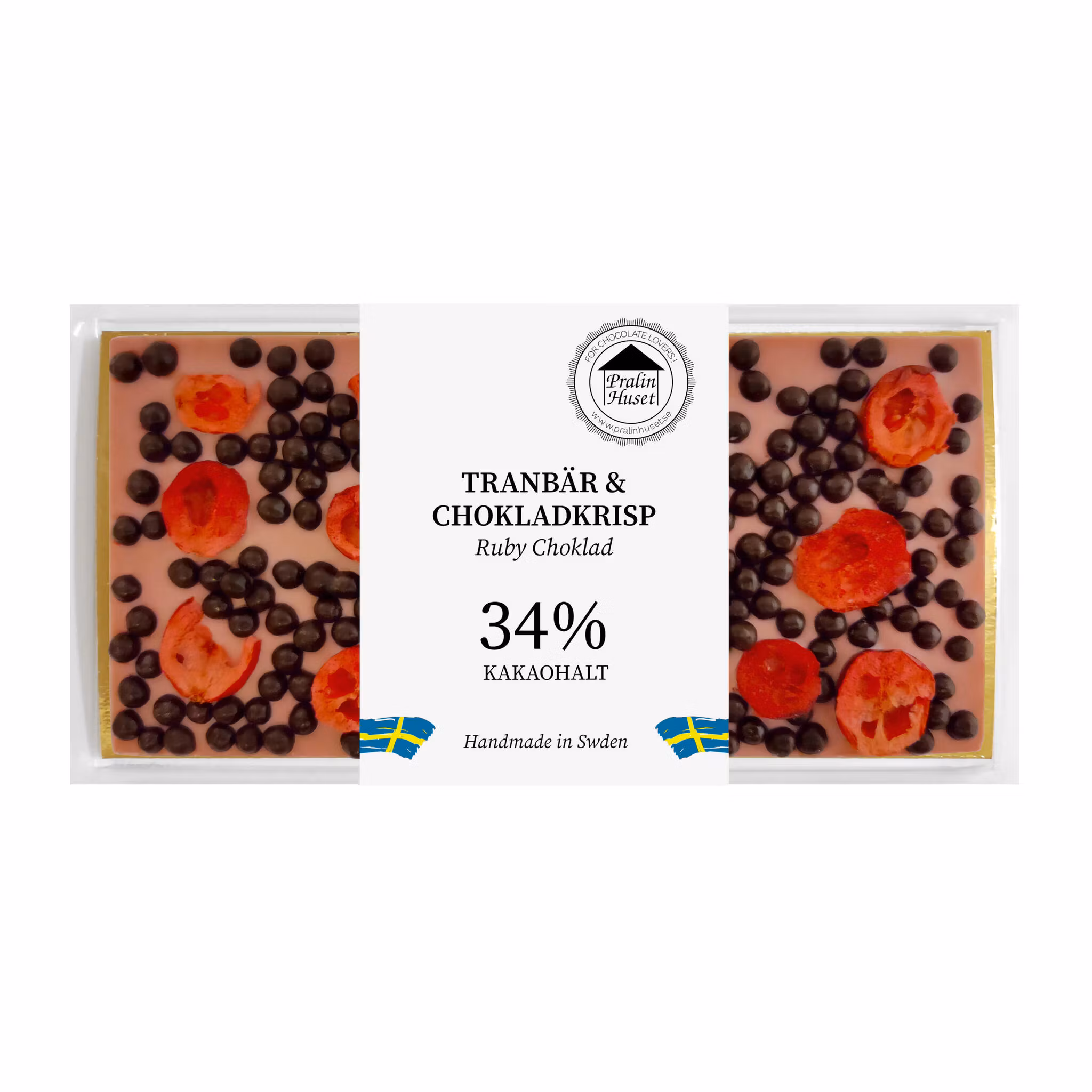 Pralinhusets egna 100 grams chokladkaka i ruby choklad, med 34% Kakao, med tranbär och chokladkrisp.