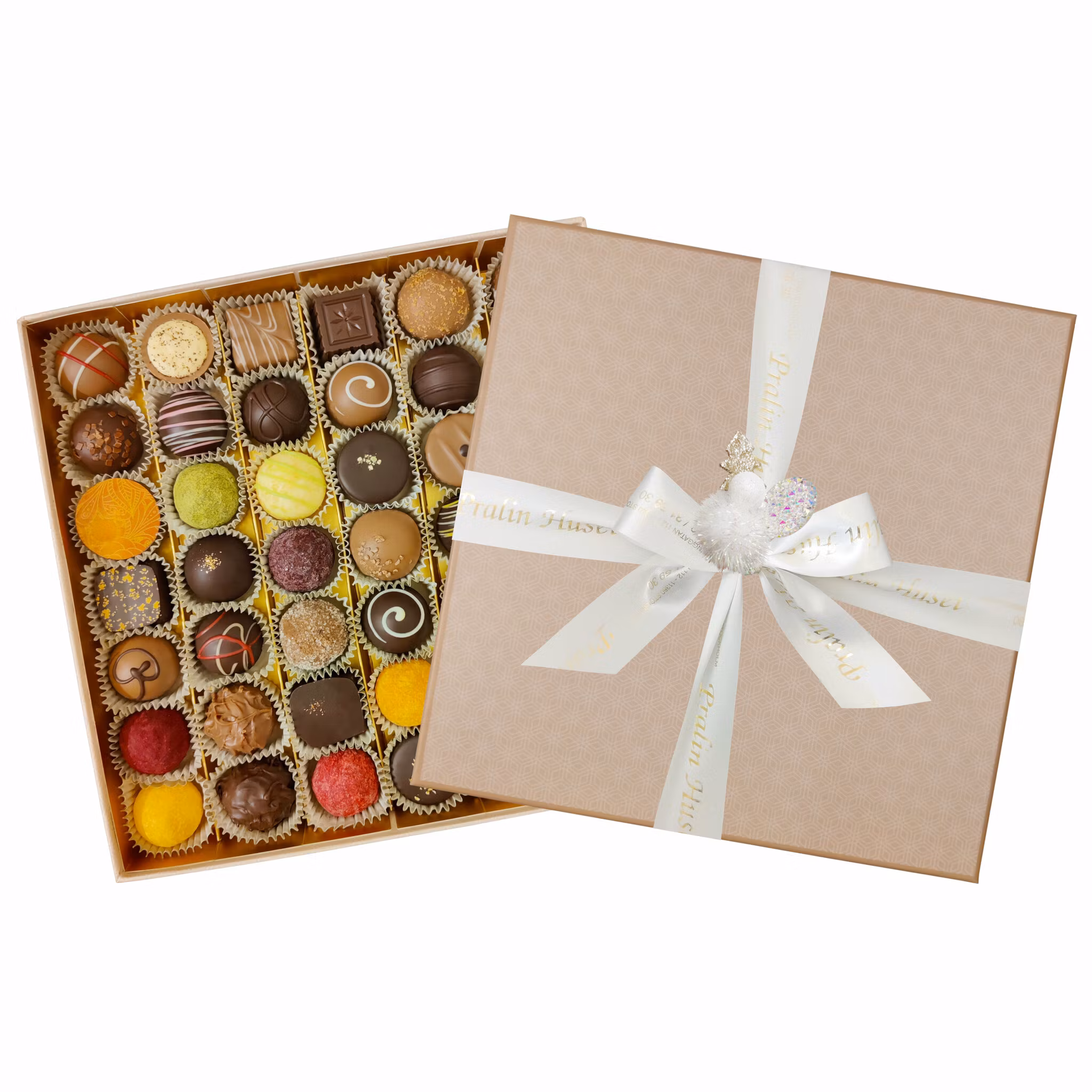 Elegant ask fylld med praliner och tryfflar. Asken finns i flera olika färger och passar perfekt som en gåva. Asken dekoreras med Pralinhusets vita band och dekorationsblomma.