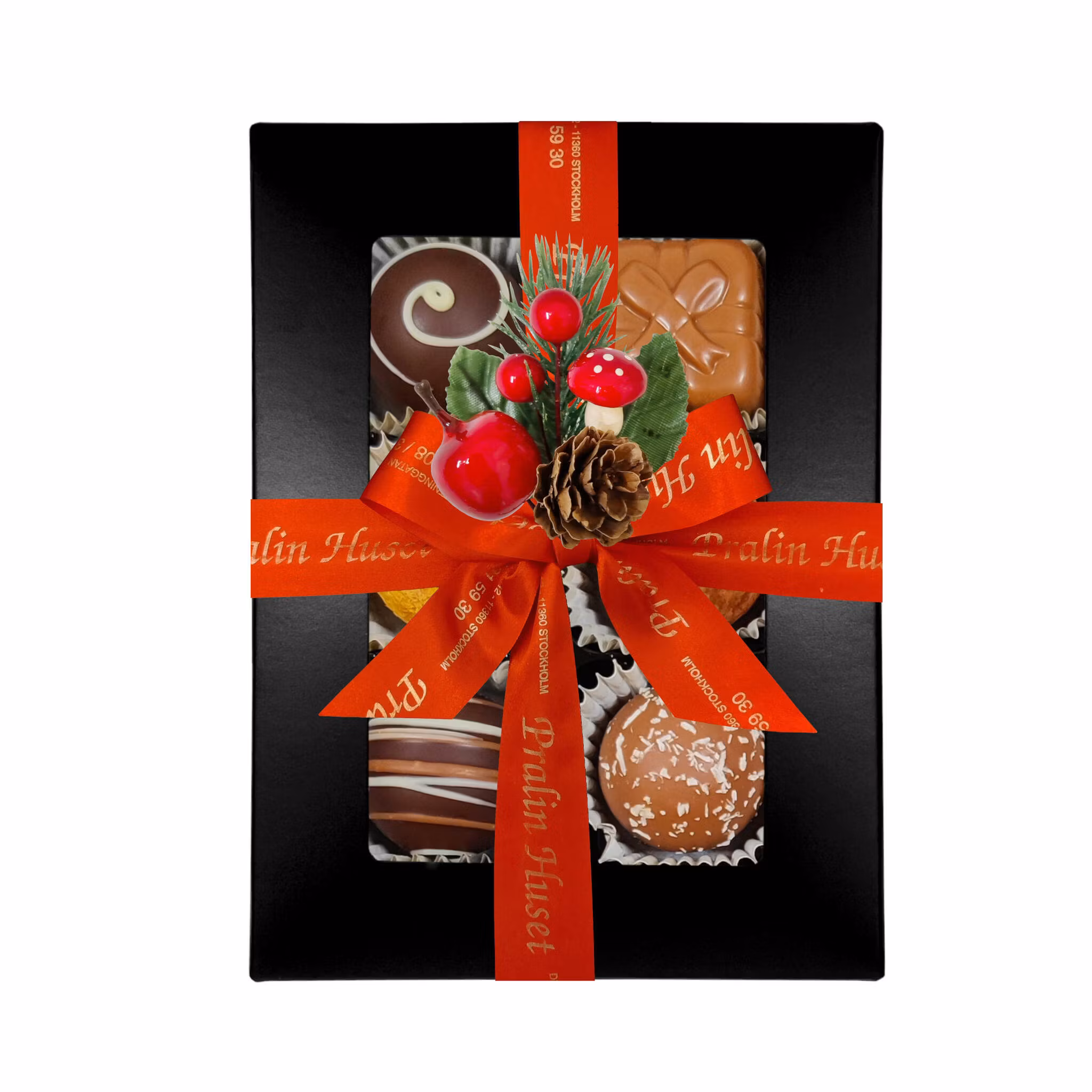 En svart ask fylld med 6 bitar av Pralinhusets egna favoriter av praliner och tryfflar. Asken kommer dekorerad med Pralinhusets egna röda band och säsongens blomma. Asken kan även beställas inslagen i blått eller vitt julpapper.