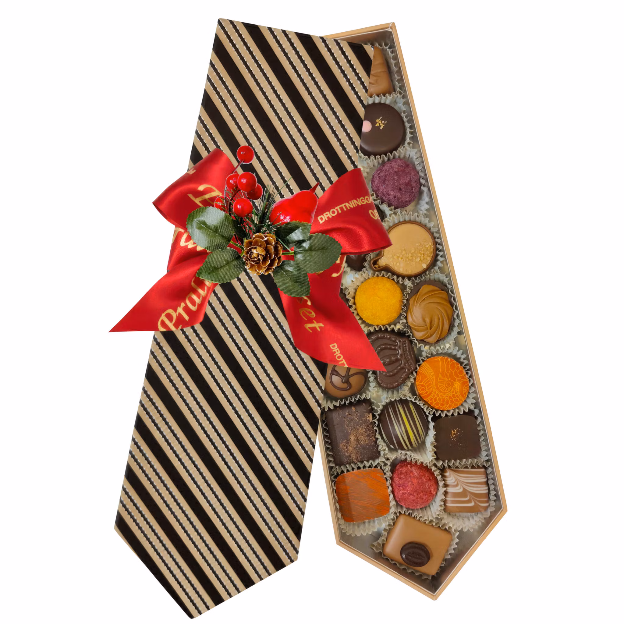 Elegant ask med färska praliner och tryfflar i husets blandning, asken dekoreras med Pralinhusets röda sidenband och säsongens blomma.
