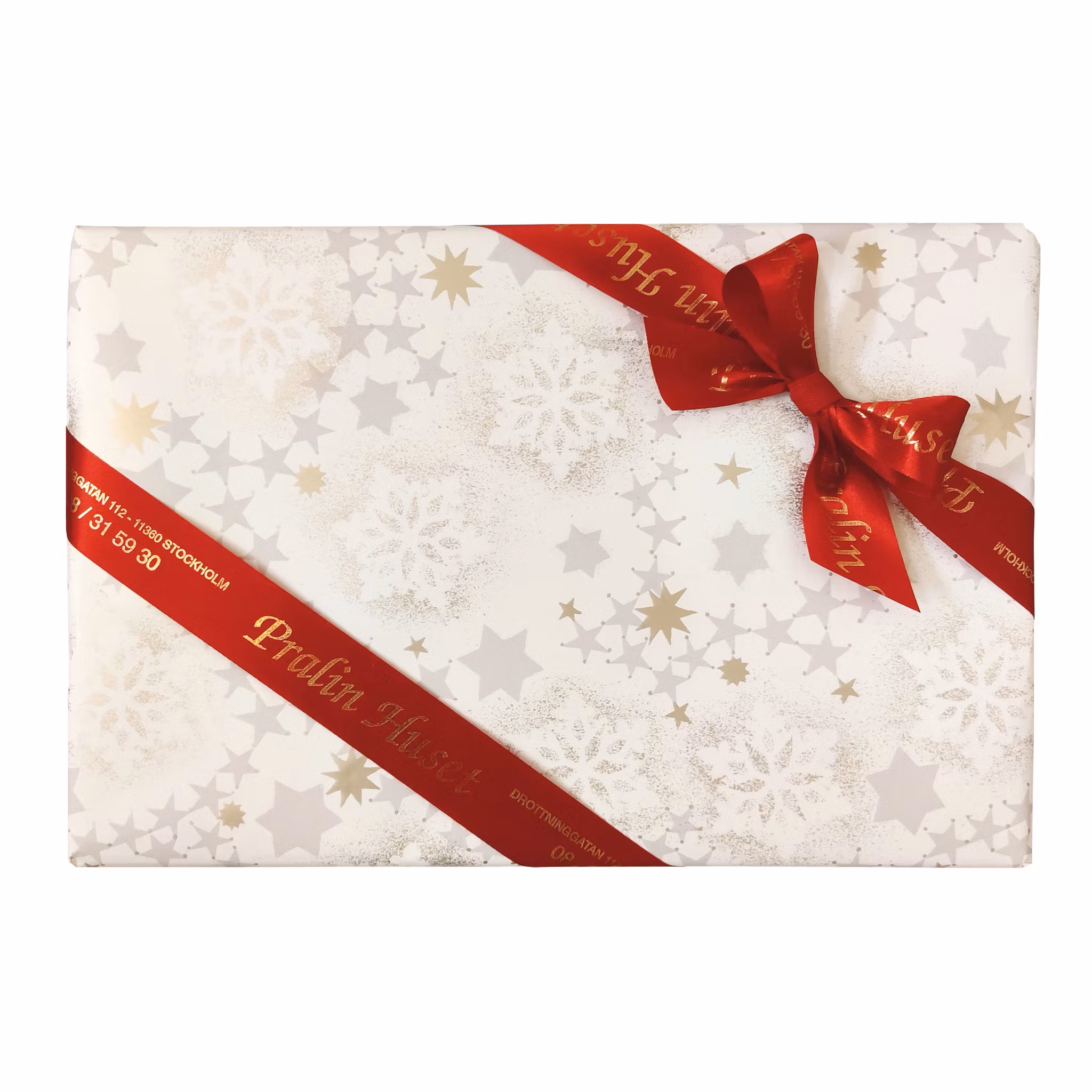 En svart ask fylld med 12 bitar av Pralinhusets egna favoriter av praliner och tryfflar. Asken kommer dekorerad med Pralinhusets egna röda band och säsongens blomma. Asken kan även beställas inslagen i blått eller vitt julpapper.