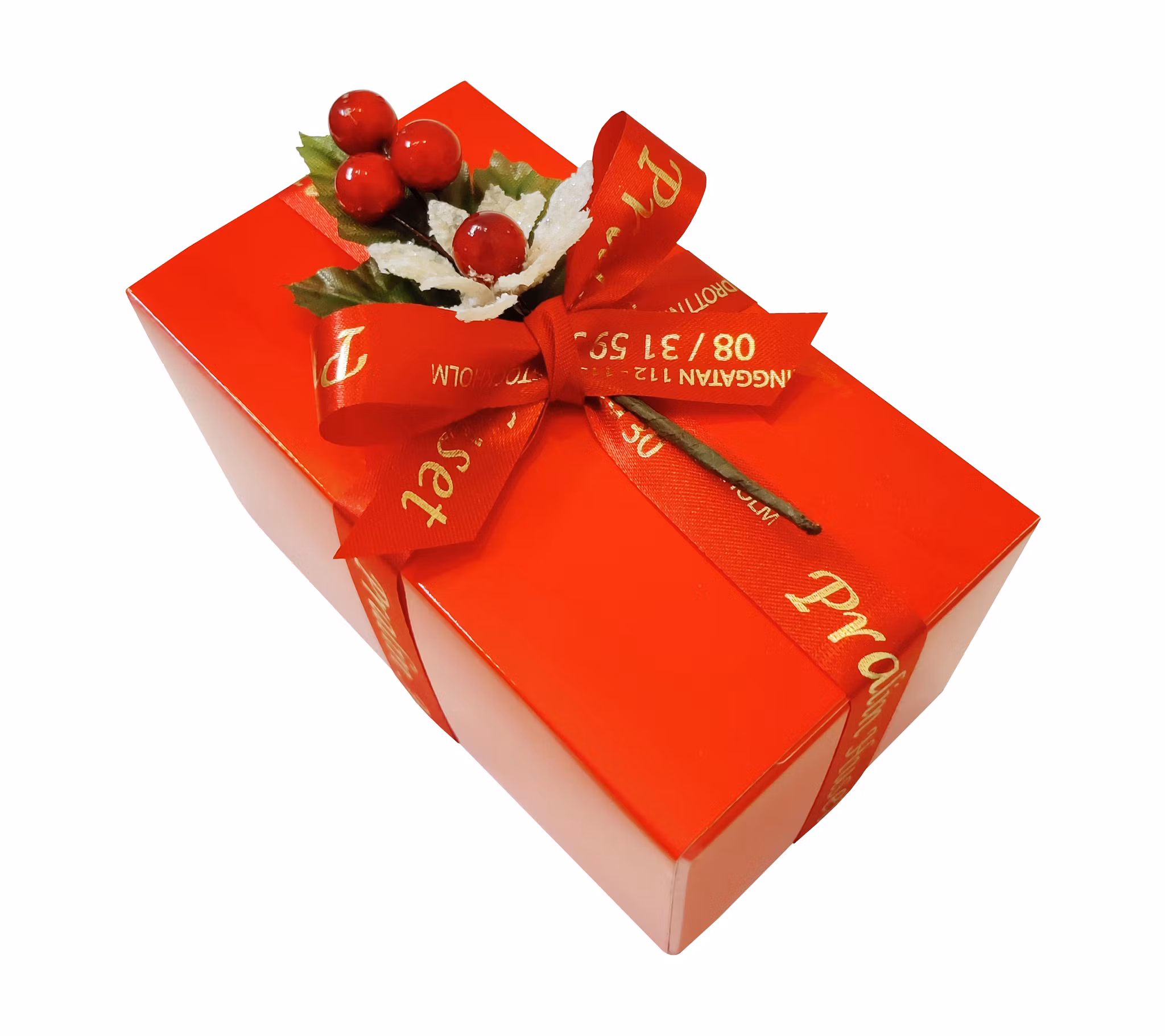 Utsökt blandning av färska Praliner & Tryfflar i vår klassiska röda Pralinhuset ask som dekoreras med ett rött sidenband och en säsongens julblomma. Asken finns i flera storlekar.