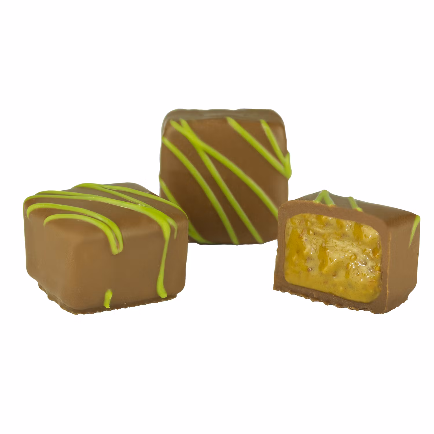 Ingredienser: socker, rostade PISTAGENÖTTER (18%), kakaosmör, HELMJÖLKSPULVER, degtrådar (9%) [VETEMJÖL, majsstärkelse, solrosolja, konserveringsmedel: kaliumsorbat; salt], kakaomassa, solrosolja, SESAMPASTA, emulgeringsmedel: lecitin [SOJA]; GRÄDDEPULVER, färgämnen från livsmedel: safflorkoncentrat, spirulinakoncentrat, citronkoncentrat; naturlig arom, naturlig vaniljarom.