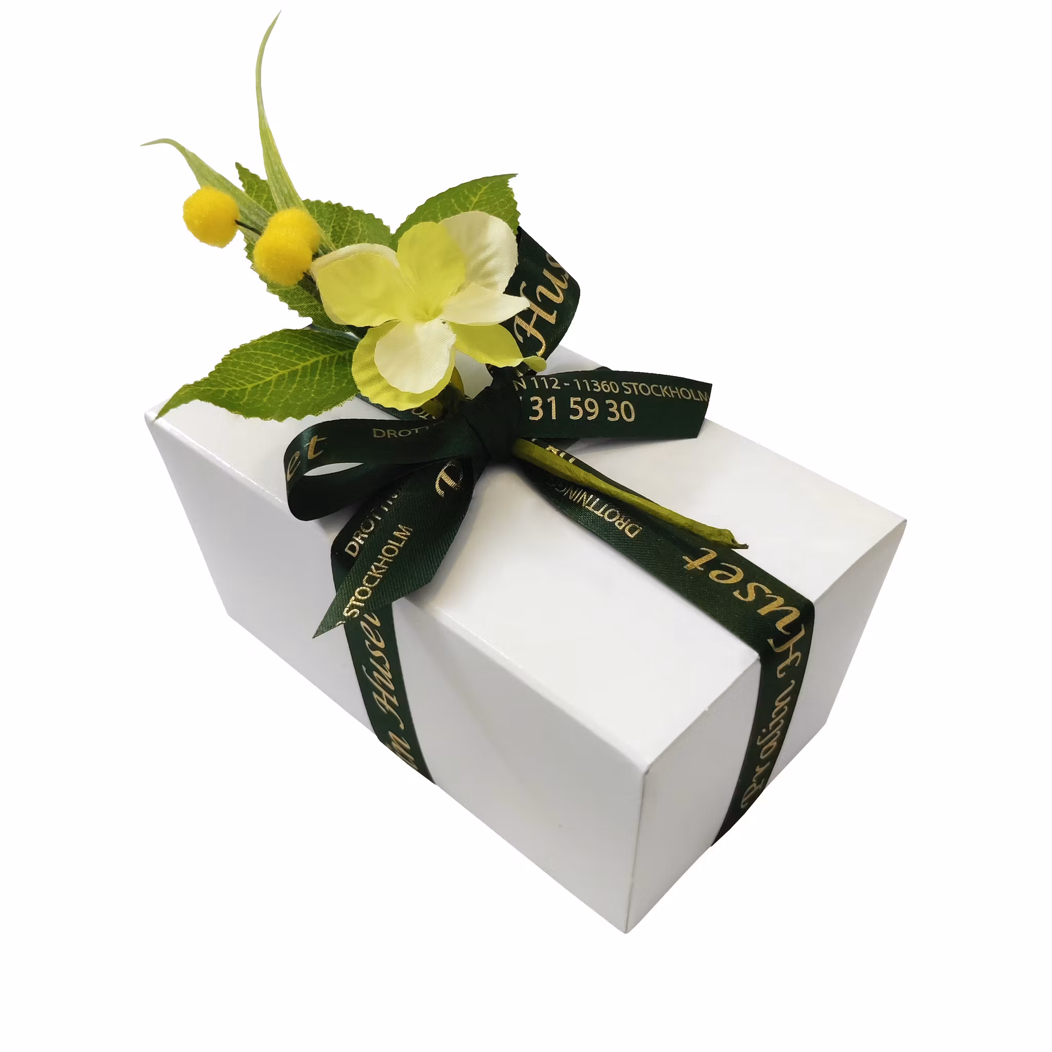 Utsökt blandning av färska Praliner & Tryfflar i vår klassiska Pralinhuset ask som dekoreras med ett grönt sidenband och en säsongens blomma. Asken finns i flera storlekar.