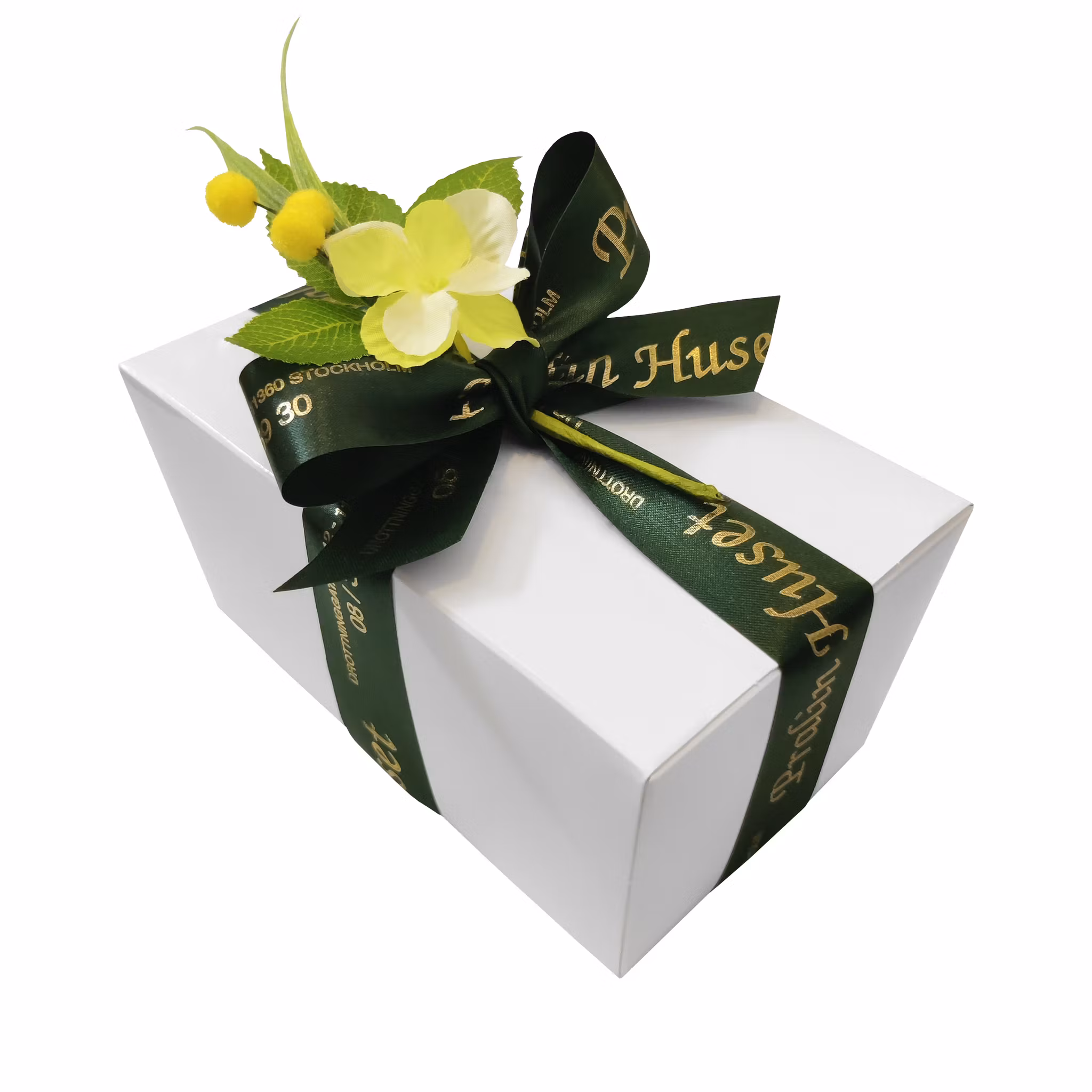 Utsökt blandning av färska Praliner & Tryfflar i vår klassiska Pralinhuset ask som dekoreras med ett grönt sidenband och en säsongens blomma. Asken finns i flera storlekar.