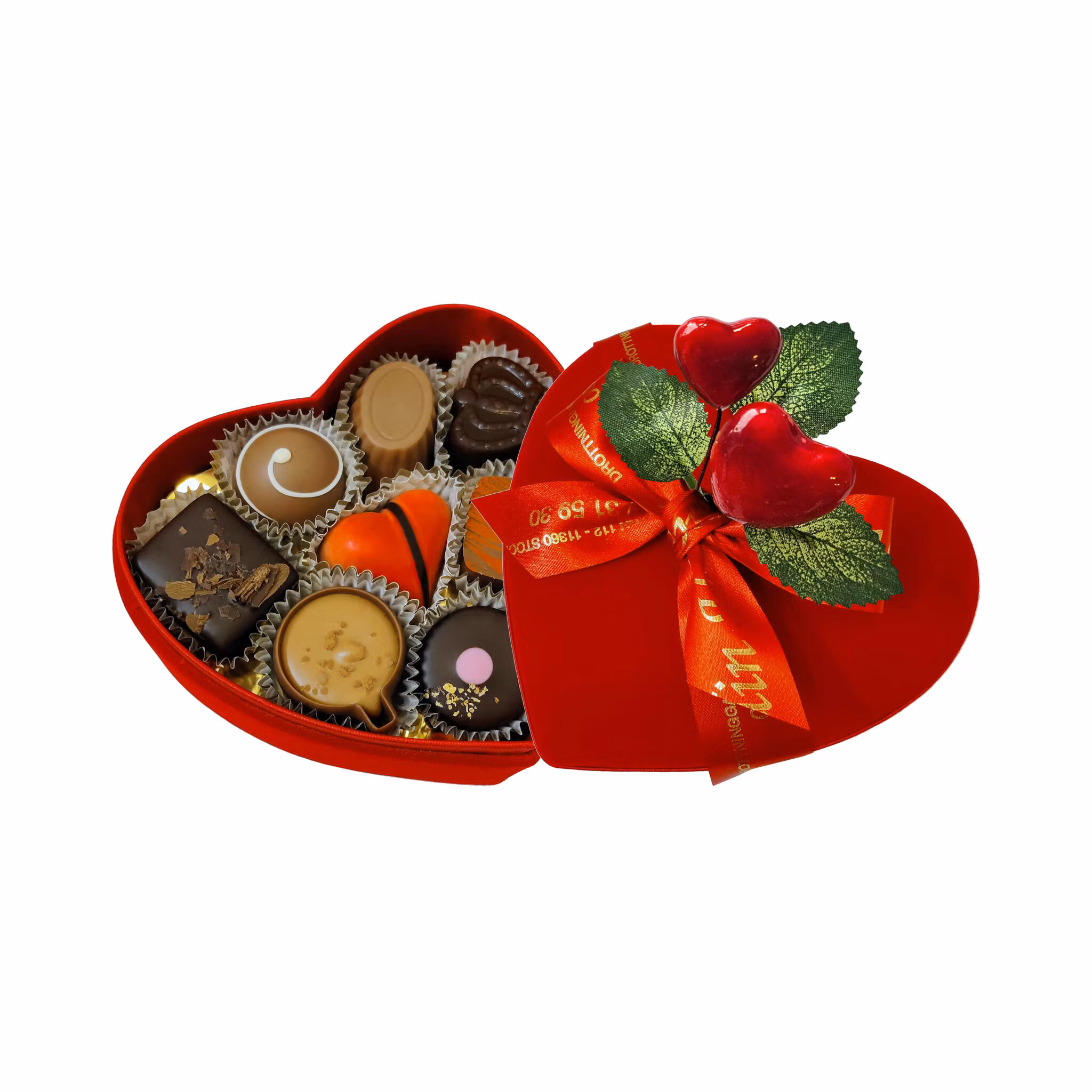 En elegant hjärtformad ask i röd siden fylld med härliga Praliner och Tryfflar. Pralinhusets röda sidenask är den perfekt gåvan till bland annat alla hjärtansdag eller någon som du håller kär och är en av våra favoriter. Denna ask har 2 våningar av praliner och tryfflar. Asken finns att köpa i flera storlekar.