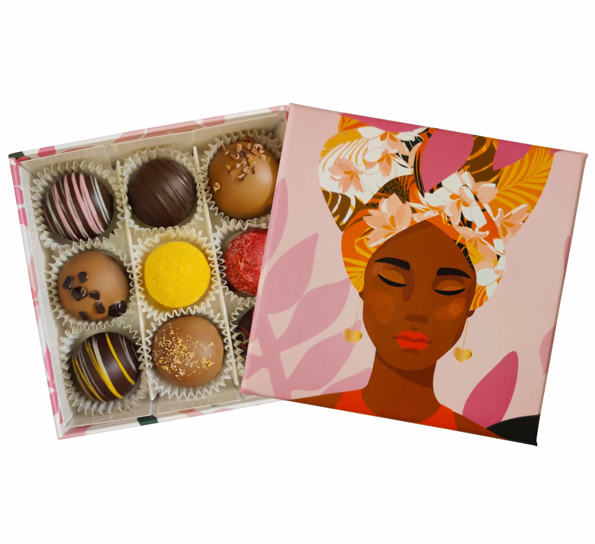 Vacker ask med färska praliner och tryfflar.